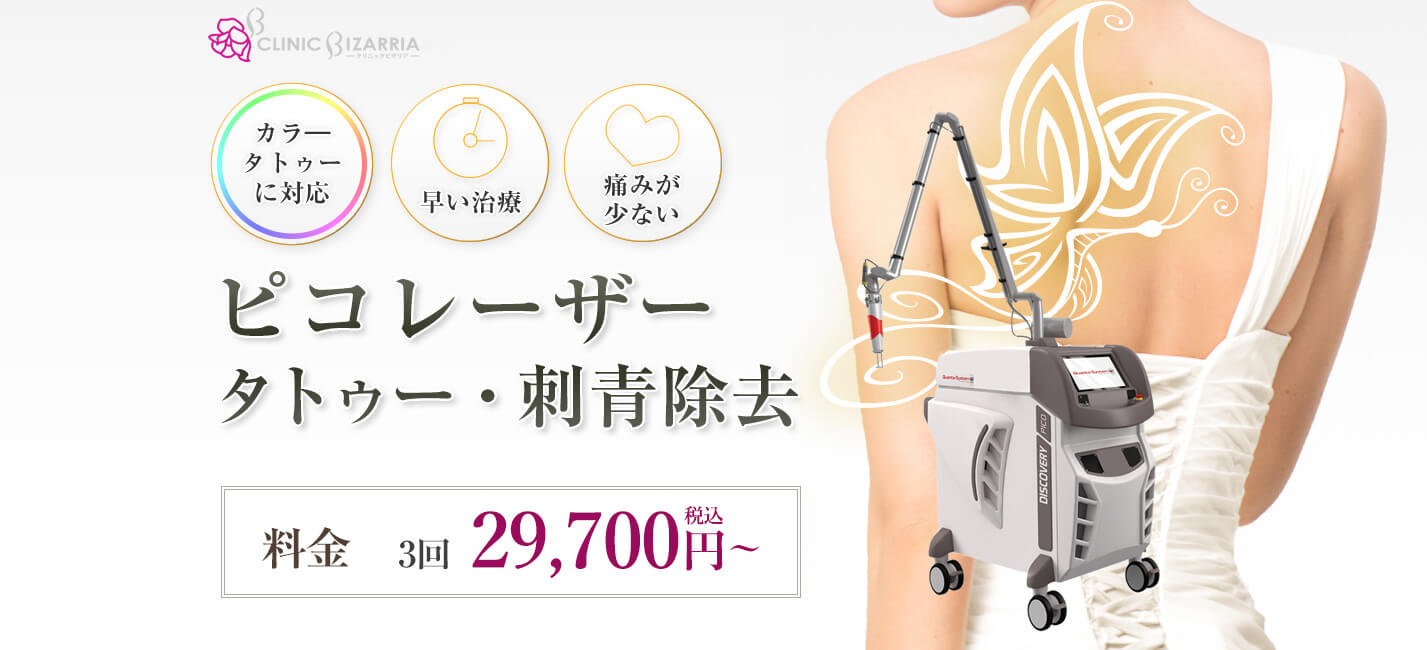 真皮層に色素を彫りこんでしまったタトゥー・刺青を消すには専門の医療機関で、高性能のレーザー機でのしっかりしたケアと安全を考慮したもとでの治療をお勧めいたします。